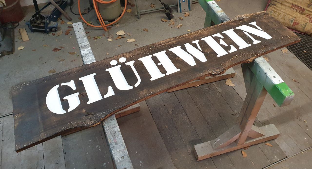 I was commissioned by the mother of a friend whose husband runs a booth on the local christmas market. Due to the size of the sign, my cousin and I decided to build a sign that is based on a large oak board.