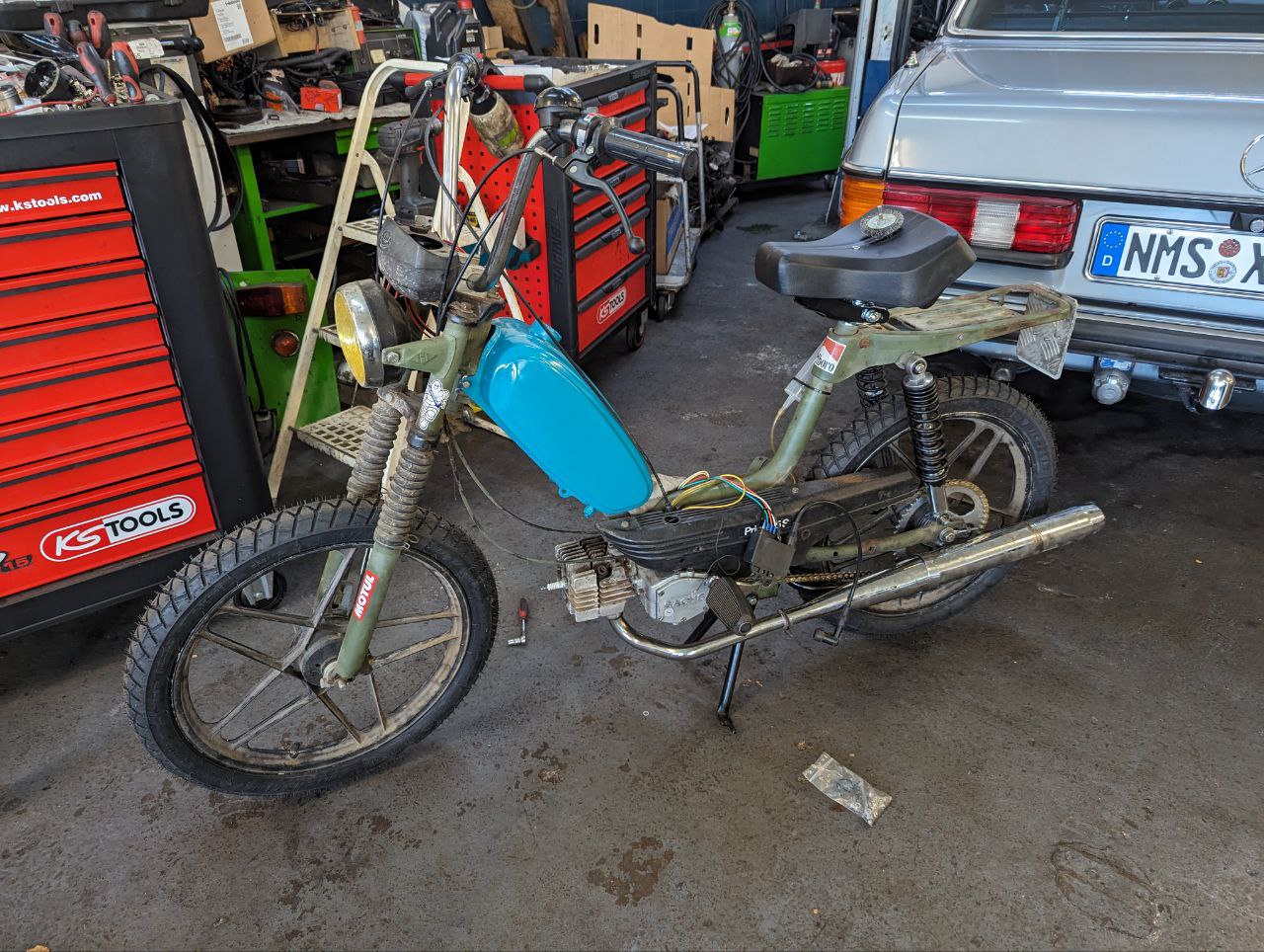 I bought the moped working and it was driving - however it was fast. It was really fast. Instead of the manufacturers 25km/h limit, it kept accelerating until 80km/h. This was scary but also incredibly fun. Sadly it was running quite unstable, loud and it was also quite hard to get going. Additionally the tyres were completely worn off.